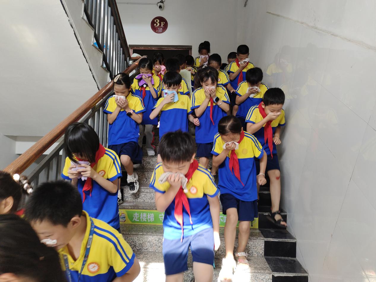 上午9时,随着急促的警报声响起,演练正式开始。全体师生迅速进入应急状态。演练过程中,在各班班主任和任课教师的配合指挥下,学生用湿毛巾捂住口鼻,低头弯腰,快速而有序地沿着指定路线疏散撤离。各楼层负责老师坚守岗位,指挥学生快速疏散,确保演练过程安全有序。仅用时3分26秒,全校师生便全部撤离至操场安全区域。各班班主任及任课老师当场清点人数,确保每一位学生的安全,按照演练方案完成演练任务。